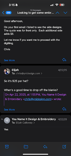 If I could give zero stars, I would. I contacted this business to have some hats embroidered, but from the beginning, the communication was awful. Chris barely acknowledged my emails and came across as disinterested in earning my business. I provided everything they needed and dropped off my blanks on April 25th, with a promised 10-day turnaround and an update to follow.
