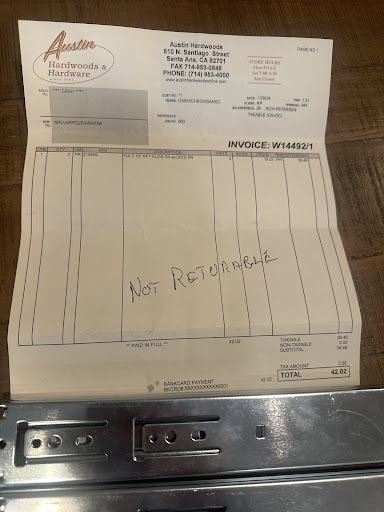 Read moreI bought 2 set of slow closing sliding and I asked from the cashier if I can return if it doesn’t fit and he said yes as long you as you have the invoice. Turns out it doesn’t fit , so I drove over to return it , after 10 days , the cashier checked out the item and said “ we can’t accept return cause one set has been used.” I goes , “ I installed both of them to see if they fit “ and he goes “ then we can not accept both. I asked for his manager but I wish I didn’t , he was so snobby and before I say anything , he said “ we don’t accept return if you used it even once “.!!! I said , this is not a pair of shoes than I can try it on in front of you , I need to install it to see how it works but he walked away and ignored me . I asked the cashier just put down on the invoice that “ we don’t accept return and stamp it “ he did that but he said “ we don’t have stamp”. I don’t know where there are many credible store that can’t name them why people buy items from this small place with disrespectful employee. Close this business if you are not able to offer very primary customer...