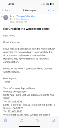 Purchaed a TV stand for $850. Once I opened the box to assemble I noticed a crack in the wood on the front panel of the stand. It was on a preassembled portion. I immediately reported it to Matt at Tempo Collection on January 2nd. He then responded on January 2nd that he needed me to send them photos and he would work out an exchange with Ashley Furniture. Today, March 5th, I finally received an email from Tempo (after calling and texting them 5 times) offering me a $75 refund. I explained that I Purchaed a new item and wanted it exchanged for another new product without a crack. He said my only option was to accept a $75 refund. THIS COMPANY IS A JOKE! I am speaking with Ashley Furniture now and they explained that it is 100% up to the retail store to exchange or replace an item. So Tempo waited 2 months to provide me a lie. BEWARE that if you purchase from Tempo collection and something is damaged that you will be stuck with the damaged product and they will push you off and delay you. Unfortunately, for them, I won't settle for this. Small claims court is my next stop. Pictures included. Crack may look minor but it's all the way through the wood and when you apply pressure to the top of the cabinet the crack opens up. Email pic shows their response to me after 2 months. The claim "Ashley offered me $75 refund" - Ashley support told me that is not true, they explained this retailer could have taken it back and exchanged it. You've...