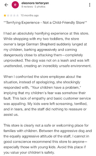 I had an absolutely horrifying experience at this store. While shopping with my two toddlers, the store owner's large German Shepherd suddenly lunged at my children, barking aggressively and coming dangerously close to attacking them—completely unprovoked. The dog was not on a leash and was left unattended, creating an incredibly unsafe environment.