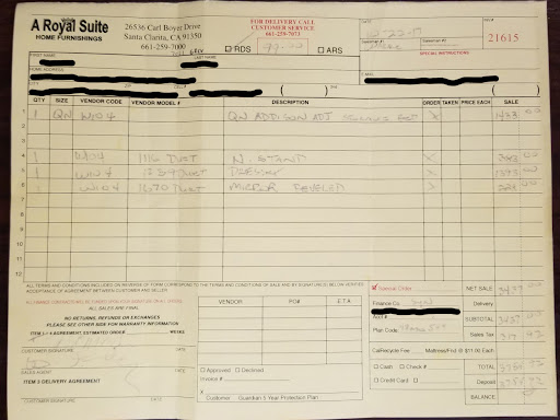 I purchased furniture here October 2017. After declining the salesman's offer of 36 month financing with 12 months deferred interest, I accepted the salesman's second offer of 48 month financing with 36 months deferred interest. He handed me an application for a credit card account, but I objected because I did not want a credit card. The salesman told me they used that form for all of their credit accounts no matter the type, so I proceeded. He handed me the credit agreement to sign, but when it said only "12 months deferred interest" I refused to sign it. But the salesman said it was OK, I would get 48 month financing with 36 months deferred interest, and he showed me the sales invoice which stated "48 mo 548". I asked about "548" and he said it was just their code. OK, so I trusted him and signed. I have attached my sales invoice here as proof. I had been hustled. My first statement from the finance company showed TWO transactions. The first was the amount of my purchase ($3,754.92) with 12 month deferred interest. The second was a charge of $548 with 48 month financing. They had put through an extra undisclosed charge of $584 so they could write "48 mo" on the invoice. Not only did they submit a bogus charge, the finance terms for the real purchase were not on the invoice. I called the finance company immediately, and they told me to simply call the store and ask them to fix it. I called the store and they pretended they didn't know what happened, but promised to fix it. It never happened. I called and visited the store repeatedly and I was very patient and nice. They always promised to fix it, but they never did. 12 months elapsed, and I was hit with $1,200 in deferred finance charges. (The finance charges as of this date have exceeded $2,400.) It's been 2 years of pleading and cajoling without success, so I tried mediation through the BBB. Their response (to paraphrase) "he signed the paper. There's nothing we can do." The bank has confirmed repeatedly that A Royal Suite has only to call them to correct the finance terms, thereby making the finance charges disappear, but they still refuse to do it. The bank can't understand why A Royal Suite won't just call them and fix it. I had a lawyer send them a letter and ask them to correct my account to honor the word of their salesman, but their lawyer fired back a nasty warning and an offer of $600 if I would remove my complaint with the BBB. It would be nice if they would just step up and say, "Sorry about the trouble. We will honor the verbal agreement you had with our salesman and correct the finance agreement to remove the charges you weren't supposed to incur." But they don't. Clearly, the initial hustle, the deception on the invoice, and the refusal to make it right cast some serious doubt upon the integrity of this business. I am in debt $2,400+ to a finance company because of...
