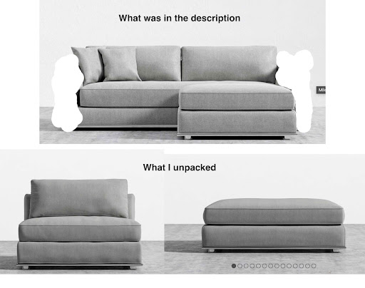 Their description always referred to the two pieces as "Milo Sleeper" not "One-Seaters." Everywhere on their site these two pieces are called "One-Seaters." So they got it wrong and I'm supposed to deal with it. Even if they say something is final sale, that's assuming that they delivered what was described, which they did not. In fact, their actions this week show bad faith on their part. I'm not complaining that the color is off, or that it has a ding in it. It's a warehouse sale, after all. But I did not get what was described and they have ghosted me.