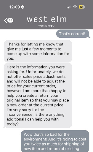 Does it seem reasonable to you that a very well-known, high-end furniture retailer would routinely require customers to order furniture that won’t arrive for approximately 3-4 months? No? Me either. But I really wanted the couch, so I decided it was worth the ludicrous wait. At the end of the 4-month period, I hadn’t heard from West Elm at all, so I called them to find out when my couch might be arriving. At this time, they told me it would be delivered on Christmas Day. (Was it being delivered by Santa? I digress). However, Christmas Day the couch still was not here. I called again and was told the couch would arrive Jan. 5. Are you shocked when I tell you the couch didn’t arrive on Jan. 5? At this point, are you also shocked when I tell you I’d heard nothing from West Elm to explain or inform me of the delay? At this point, you shouldn’t be. But it gets worse. I began to email to complain about my experience and was contacted by several people at customer service, many who said they were sorry, but only one person offered to help and to compensate me for my trouble. After several back-and-forths, Christopher E wrote: “I have added your order number to my follow-up folder, so that I can credit you 15% of the order total, because of the inordinately long wait for scheduling and delivery.” After disrupting, and planned to address this amount when the item was ready to be delivered. Yesterday, Jan. 18 (I’ll allow you to note for yourself how far past Dec. 25 that is) I received a call and email that the item was ready to be delivered. Before I could even initiate a conversation about how to address all of the poor service outlined above, my credit card was charged for the full purchase price, despite Christopher’s promise. When I contacted West Elm to address this, Jamie said they would not honor even their initial, feeble offer of 15% to assuage my anger at this entire experience.