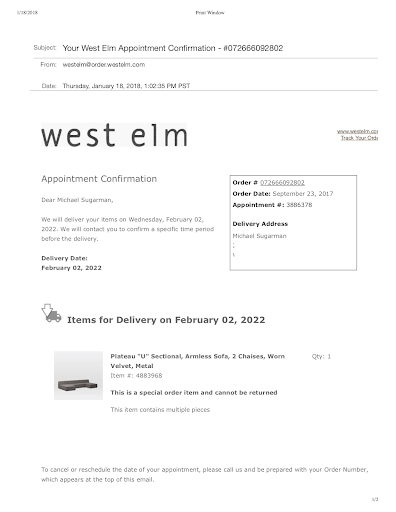 DO NOT BUY FROM WEST ELM! Sure, their furniture looks nice. It might actually BE nice. But that only ever matters if you actually get the furniture in the first place. However, after ordering the couch in September 2017 (you read that right: a full 5 months ago!) I do not have the couch. And I no longer want it. Here's why: