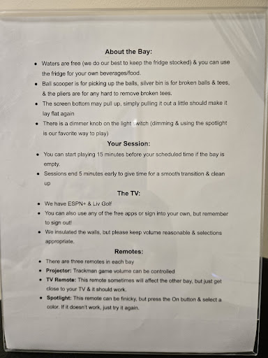 Very cool concept, easy to access through trackman app, easy to book a time and easy to access building/ bay when it was time. I booked the “forest” bay and was pleasantly surprised with the set up when I walked in. Plenty of room for you and 3 buddies to play a round of golf. The simulator itself was very easy to use if you’ve ever used a simulator before, if you haven’t click around and you’ll figure it out. I hit some balls on the driving range and played a round of golf on the simulator. I had the bay to myself for an hour and managed to hit 30-40 on the range and played 18 holes. Round went smoothly with no real issues, every once and awhile the screen saver would start up if you didn’t move the mouse. They had plenty of tees and balls to use in the simulator which is very nice. All in all a pleasant experience and will be a return customer for sure.