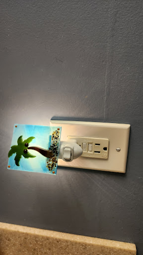 My friend and I visited the Laffing Glass studio and store and met the owner, Leslie. She was so very friendly, even offered us a glass of wine and chocolates while we shopped! Her products are beautiful. I ended up buying a nightlight and when I got home realized it was the wrong orientation - I emailed Leslie and she was happy to send me a plug converter at no extra charge so it would face upright. Picture is before she sent me the converter, but it's such a beautiful glass piece! Highly recommend her work...
