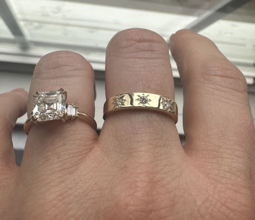 I can't say enough about how amazing my experience has been at L & L and with Andrey. My fiancé and I are local and stopped in to check out the shop one day to browse and are so happy we did. Andrey is seriously the coolest and so incredibly skilled. He's super nice, very, very knowledgeable and takes the time to explain things and show examples & comparisons. After learning more about him, his years of experience and design work, I decided to turn my mother's engagement ring over to him to be redesigned into something I would actually wear. The ring was from about 1980 or 1981 with a gold nugget band, super tall setting and 7 tiny diamonds in a cluster on the top. Not a style I would ever wear. I've been wanting to do this since I got the ring about 15 years or so ago but was always so nervous that I'd ruin something important. Meeting Andrey changed that for me almost instantly and I'm so grateful for his beautiful and careful work on something so special - and so fast! He used 3 of the 7 stones to represent me and my two siblings and we'll be using 3 more of the stones to create a matching ring for my sister with the wedding band from the set that she was given. I couldn't be happier with how it came out and am so grateful. My sister's two girls will have these rings down the line which we're so...