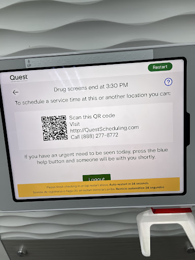 I scheduled a 2:30 PM appointment for my daughter at the Hoffman Estates location through the Quest app. Upon arrival at 2:28 PM, I checked in at the kiosk and via a text link. Despite following these steps, we waited over 33 minutes while others with later appointments were called ahead of us.