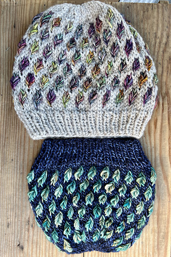 In addition, the kit for the pattern in question (and it looks like others) are sold using yarn that is not recommended in the pattern. For example in the light bulky kit for A New Leaf the yarn kit has a recommended yarn for the accent but the yarn sold for the base is not one of the recommended and has a larger gauge. Sharing photos of the kit, the beanie made with a kit (oatmeal colored one) and one made with recommended yarn. Both knit by the same person. One beanie fits the other is way too big. It makes me sad that a newer knitter would tend to buy a kit and encounter this situation and think it was due to their skills or lack of skills, or think poorly of the designer who created the pattern.