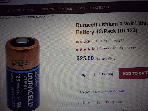 A couple other points, I finally bought my batteries today in-person from Target and paid total $18.35 for 4 Energizer Lithium 123 batteries vs about $50. from Batteries+ for 4 batteries. Yes, I am not too happy about that, about their "on sale" price. How insulting is that?