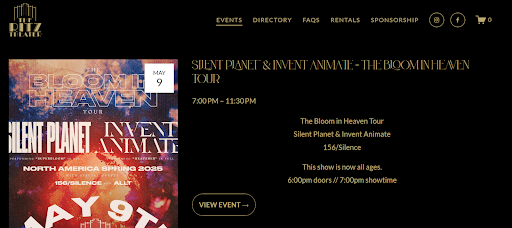 Went to see Allt, 156/Silence, Invent Animate, Silent Planet on 5/9/25. The website for the Venue stated that doors opened at 6:30pm and the show started at 7pm. See pic posted. By the time that we got into the venue around 6:45pm, the first band was playing their last song from their set. This was the band that we traveled almost 2 hours to see. The entire floor in front of the stage felt like it was going to collapse down to the level below. It wasnât just vibration as you could feel the floor actually flexing. In an old theater like this, it was frightening. We went to the upper levels in an attempt to get to a safer area. You could feel the building flex higher up but it definitely wasnât anything like when we were standing in front of the stage. Security then stopped people from going to the lower level in front of the stage for the rest of the show. We later found out from the bands that the show was sold out. We paid to see all four bands and arrived on time. Shame on you Ritz! I would never recommend this venue to others as show start times are unreliable according to the Ritz website and you truly feel unsafe in the building. There should be an âenter this building at your own riskâ...