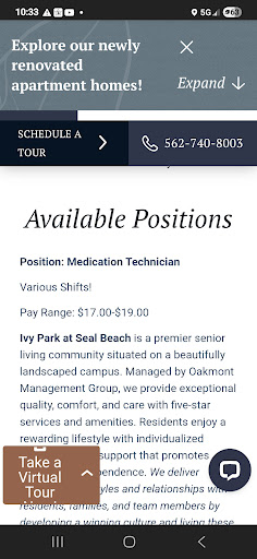 Read moreI dropped by Ivy Park at Seal Beach without an appointment and had the good fortune to meet with Tami Ojwang, the Executive Director on 2/12/2025. Unlike other places I had visited, the ED wanted to know about my dear friend – her physical and mental health, interests and hobbies, functioning level, current situation, etc. before discussing the many services of the assisted living and memory care facilities. After a detailed conversation, we went on an extensive tour, including the dining rooms, living quarters, yard area, and multiple activity rooms. , We were introduced to several staff members who also generously answered our questions and concerns. Everyone was friendly and gracious. Perhaps most important of all, the residents were smiling and actively engaged and told us how pleased they were with their care. We were so excited to have...