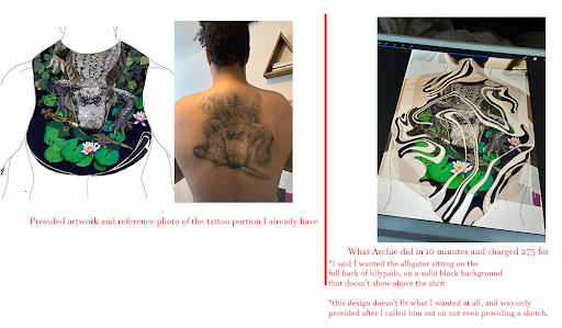 The artist. I picked one of the most painful spots (sternum and ribs), and I changed the placement and look of the design on the day of. Archie made me feel safe and never complained once the entire time about my changes. We spent several hours placing the stencil and making sure the art was absolutely perfect (it’s an awkward spot and a big piece and the body is not perfectly symmetrical unlike this piece lol), which made me feel extremely taken care of. I couldn’t last the entire day but Archie cheered me on and told me we could break it up into two sessions, which we did. This spot is very revealing as well and he consistently checked in with me about privacy and how I was feeling MANY times throughout both sessions, if I wanted a screen up or a blanket or anything to cover myself up with. I have not felt any other tattoo artist go out of their way to make me as comfortable as Archie did. Besides that, his art of course, speaks for itself.
