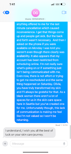 It would be good to know from dermaspace are the customers not to expect consistent results post the same facial? If so, the expectations should be set upfront before booking appointments so that the customers have the required knowledge. Or I am not sure if it was the change in the esthetician with the second facial or the esthetician's skill level that makes the difference? Then I would have gone the extra mile to book the same esthetician. Or was it simply a change in the intensity setting of the electric current used that made the difference which should be consistent as well to at least have the same results from last facial if not better. Not sure but severely disappointed with the results after second facial. I followed the same exact precautions after second facial that I did with my first facial.