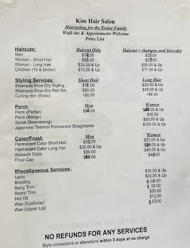 I’ve been a customer at Kim Hair Salon for the past 1.5 years. Have gotten multiple haircuts and perms and would highly recommend Mrs. Kim especially if you’re an Asian male lookin for a cut. Prices have increased by a couple extra dollars since I started going but even still I don’t think you’ll find a better value hair salon for the quality of haircuts (currently $20 w/o tip for a men’s haircut, $65 w/o tip for a perm and cut). Highly recommend!