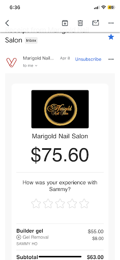 On April 20th I booked another appointment after receiving a phone call that they would fix my nails for free. I figured that met they would have my name from the review and coming in the past as well as from the phone call. It was wrong of me to assume they had this info. Mia I believe redid my nails and used the same technical I had as my last appointment. I guess this salon just doesn’t do builder gel and is just lying to people. I’ve seen videos of a slip layer and bead being built this salon...