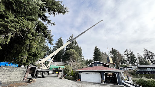Getting it in position was also not trivial, because removal and replacement required a crane that could lift the tubs OVER our three-car garage from the street. About an eighty foot reach. David was there on his day-off to oversee the adventure, deliver the final chemicals for setup, and document the feat in pictures for me.