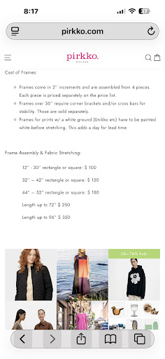 I had an extremely disappointing experience with Pirrko Seattle that I feel compelled to share. I spoke with an employee twice to confirm the cost of stretching Marimekko fabric onto a canvas riserâboth times I was told it would be $180, a price also listed on their website. Based on this clear communication, I drove an hour each way to the store.