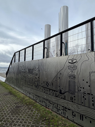 Beautiful tiny beach with splendid sprinkle of art + poetry about the transformation of dirty urban discarded fluids into clean ocean-is-the-limit freedom. I needed to write it all down for my sense-making - because the words on the metal plaques were spilling exactly like water - unpredictable, fast, playful and thoughtful, inexorably heading to the ocean. Worth visiting if you like everything water.