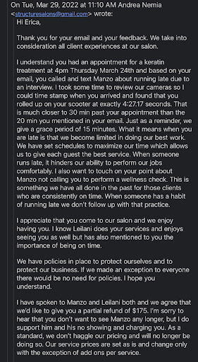Interpret however -- but I do not recommend working with Manzo or this Manager (Andrea) at the salon if this is how they treat recurring high spend clients. I was offered a partial refund but they reply is what sucked, and the fact that they don't understand long term CLTV (lifetime value), especially since I visit a lot and refer!