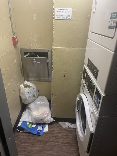 I live on the 9th floor, and several times the trash chute has been piled all the way up and I would have to dispose of the trash by taking it outside.