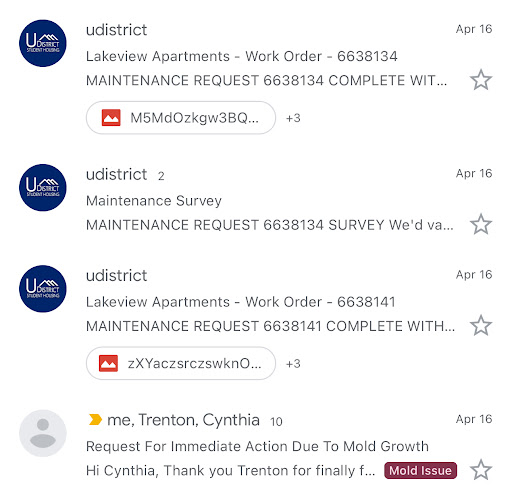 As if that wasn't enough, the mold is now so bad that I wake up every morning with rashes all over my body. I’m constantly congested and struggling to breathe. The only relief I get is from sleeping with the windows cracked open—and we live in Washington, so that’s only possible when it doesn’t rain. Despite all of this, they refuse to even have a conversation about lease termination or how they actually plan to fix the root moisture problem that’s keeping the mold alive.