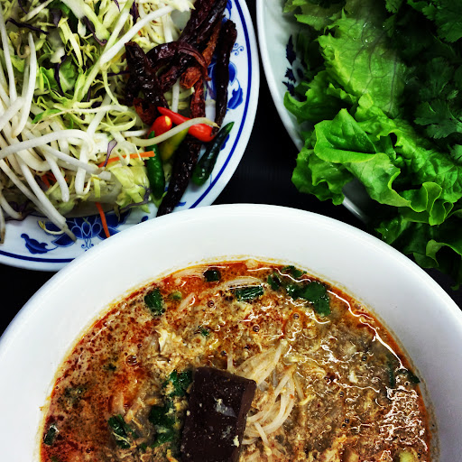 My personal favorite is the mee kati, Lao-style, a curry noodle soup that is hard to find around here (some places have the northern Thai dish by that name, but it's much different). If you like curry noodle soups this is an all-time great one.