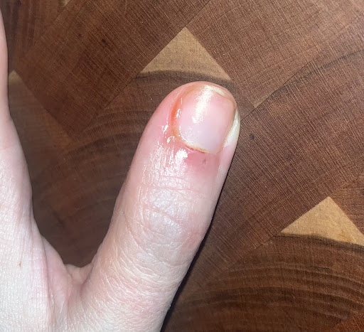 **update on my cuticle they cut completely off. Day one after injury photo. There was no apology for this. No refund offered. I was blamed for having “too...