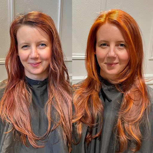 I’ve been using professional red dye at home for 18 years and have run the gamut of colors and conditions for my hair. I liked my base home-dye color and wanted to keep the autonomy of touching up my roots but came to Saige to add definition, dynamic lighter parts, layering, and improve the shine of my dull hair. I met Saige and was instantly struck by her color knowledge, her long term thinking about my hair goals and how collaborative she was in strategizing.