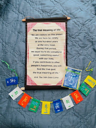 I got one of the many scrolls. They only come in one size. But also offer them in greeting cards. I also got some prayer flags that says Om Ma Ni Padme Hum. They come in the three sizes. I got the mini which is about 2 inches and I got the medium which is about 5 inches. Thereās one more size about the size of a piece of paper.