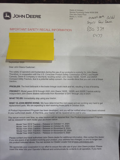 However, my experience with their service department has been disappointing. I received a safety recall notice for the brakes in September 2024 and was told the repair would be free, take about 30 minutes, and that I should stop using my tractor until the part was replaced. They assured me I would receive a call when the parts arrived, but I never did. After waiting months, I finally called on March 20, 2025, only to be told to bring my tractor in. When I mentioned that I was previously informed they would come to my residence to perform the repair, I was then quoted $250+ for them to come out.