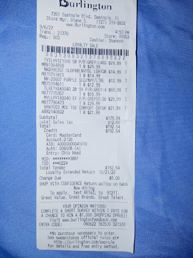 Read moreThis location is great for lounge wear, general basics, and toddler items! They have a lot of activewear, but unfortunately did not have any sports bras in size small that were viable other than that I was able to pretty much all of the items that were loungewear that I lost during hurricane Milton. I got three or four sweatshirts top name brands. I also got a few loungewear pants and some plain T-shirts. A couple pairs of toddler shoes, and a pair of slides all for about 150$ to say the least that's pretty good in this current economy and everything was brand-name. As an added bonus, I did go to Dick's Sporting Goods a couple days afterwards to see if I could find a fanny pack for my gun. I ended up purchasing a small fanny pack that was brand-name for about $40 a couple days later I came back to this Burlington and they had the same exact fanny pack for 1299 always come here before you buy anything brand off-line or in the actual...