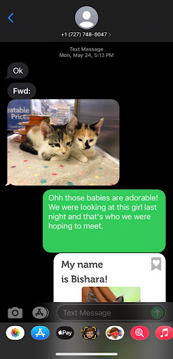 I called the listed number for the rescue and mentioned "Bishara," the kitten my spouse and I had seen online and hoped to meet. The woman rushed me off the phone saying a foster has that cat and she will text me. You can see by the screenshots I shared how the texting began and she clearly did not send me a photo of "Bishara." She did not even respond after I sent the photo of the kitten! Two hours later I had to send her another text to get her to respond.