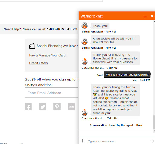 We eventually ordered the appliances online in August 2020 and used the print out and SKU numbers given to us by Derek. I flew to FL to take delivery of these appliances and they were supposed to be delivered on 10/15. We had paid for haul away. The night before delivery date, we received an email from home depot saying that delivery date has been postponed to 10/27/2020. I called home depot and was told that this was due to manufacturing delays. They did not have a satisfactory answer as to why they did not know about this delay until almost the date of delivery. They did inform me that any adult can be available to take delivery.
