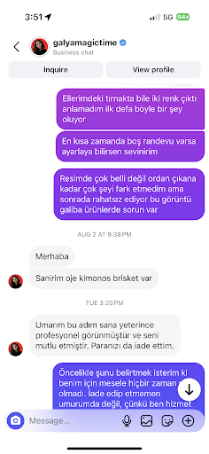 After my visit, I simply left an honest review about my experience I never asked for or mentioned a refund. However, instead of accepting feedback in a professional way, the owner called me after my review and began blaming me, making me feel as if I was being accused of something. Later, I even started receiving messages on Instagram, which made the situation worse and felt very unprofessional. The refund you mentioned in your response was never requested by me. Presenting it this way publicly makes me look cheap, which I do not accept. A professional business should address feedback with respect and focus on improving their service, not by trying to discredit or embarrass a client. As for the issue of gossip, I only mentioned it because I personally heard from Galya inappropriate comments in Russian during my visit. I even heard disrespectful words used about another woman who didnât tip, which made me uncomfortable. When I later mentioned that I also understand Russian, one of the staff was visibly shocked. This is not the kind of atmosphere a client should feel in a professional salon. I never asked for a refund thatâs not me. What really matters is how disrespectful and humiliating you acted. Funny how you seem more concerned about money than manners, especially considering the very bad words you said in Russian about the woman who didnât leave a tip and you didnât even know I understand Russian. I have the right to share what bothered me during my experience without being harassed afterward. A respectful business takes criticism as an opportunity to grow, not as a reason to attack or blame the customer. That is harassment, not customer service. Instead of attacking clients, you should focus on improving your service.