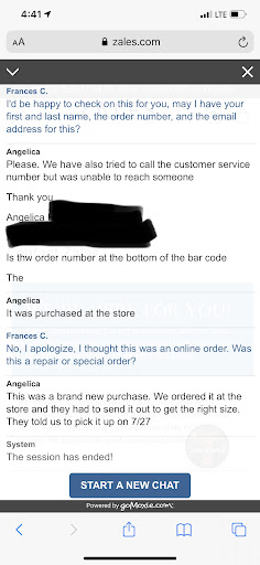 I started a chat with zales today, explained my situation and somehow after I explained it, the session was disconnected. I then called customer service, was on hold for 40 min only for someone to answer, me explain and then hear no response from them. I sat on the phone for over 5 more minutes and then they hung up.