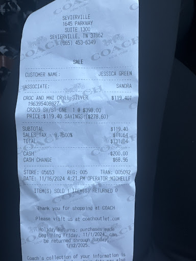 Read moreWe went into Coach because we like them and we were greeted by Jesse. He gave us our space and let us look around but always seemed to appear at the right time when we had a question and he helped provide excellent information, suggestions and what was the best deal to get the most for your money. He was fabulous. Amazingly, he helped me and another lady who was shopping nearby while not "pressuring us". I really liked that. Now after Jesse had approached us , 2 other people asked to help us but we were already charmed by Jesse. So when we went to check out, the lady asked us who helped us and I said, Jesse, he was awesome, he was "everywhere ", ironically the lady who was shopping next to me was checking out too and she agreed. We had a little giggle about it. So if you're in town and want excellent customer service, please go visit the Coach outlet and see Jesse,...