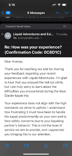 Last Sunday, I took a trip with liquid adventures for a bear glacier kayak in Alaska. And while my experience with their sister company exit glacier guides for an ice climbing trip was amazing, the experience I had in my kayaking trip was the worst. I was paired on the kayak with some person I didnt know. And I had to kayak 80% of the time as all he did was take pictures and selfies, and would not contribute to the kayaking. We were left behind the rest of the group most of the time as everyone maintained a pace, and this person did not contribute to kayaking, and it was very difficult for me to kayak for both of us. I dont think the guide cared at all about this. I had paid a lot of money to this company and put my faith in them to make sure my experience was good. I am not responsible for some random stranger whom I didnt even know. I took a week to speak over the email to the Kayak Manager James, and he seems to think that since I was taken to the glacier and came back, the trip is completed. Also he thinks that I should book a private tour, as they can pair me with anyone they want, and this is a beginners kayak trip, so no experience is needed, hence its totally okay if one person just sits and the other person has to do all the work. I am sure this is what they do, so this might be just another incident they ignored. Not only was this experience unpleasant, the person whom I was paired with, had zero common sense. He was so busy taking photos that our kayak collided with icebergs 2-3 times. One time, one iceberg completely toppled and the guide asked us to be careful. But it was not possible for me to handle the kayak alone, and this person on my kayak wasnt participating, and when he was kayaking, he was doing it with so much force that we would collide with a fellow kayak or the rocks or an iceberg. I hope everyone knows how dangerous the glaciers can be. The company made me sign a waiver, but I did not take responsibility of any other person's stupidity whom I didnt even know.