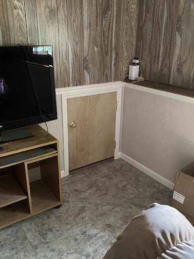 The wall and flooring got installed during the rest of the week. A ugly and amateurish access way to the water tank and main cutoff valve was replaced with a simple 8" access panel for the valve and a new door on the far side of the space under the stairs for plumbing access. Shondee Blake the carpenter and Bruce Reynolds game up with a good plan that Blake did a first class job of following.