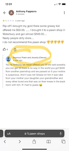 Huge ripoff on silver silver coins and any coins or collectables dont even no how to distinguish a deep mirror morgan from a basic ms he only does graded but charges a fortune for basic ms better of buying and selling on ebay scam artist here avoid the seymour pawn shop go to the 1 in derby by big y is much better if u do end up needing a pawn shop much more fair prices with gold coins and silver coins also diamonds they pay top dollar this guy in seymour pawn offered me a 100 dollar loan for almost 100 unc raw deep mirror dmpl umc morgans collector's try to figure that 1 out check out my ebay at e-bay62133 and see my 100 percent feedback om all type of high grade morgans i sell i sell to big stores and deakers all over tye world and hold 100 percent feedback and deal with almost all high grade raw coins deep mirror cameo dmpl morgans .avoid this shop at all cost ripoff had to give a 1 to post but deserves a great big zero. If u think this review is fake or exaggerated contact me and I will show u what he offered me a hundred dollar loan for I dont give a bad review to someone who don't deserve other pawn in Ansonia gave me a hundred dollar loan on 4 of my coins this guy wanted 75 coins pl to deep mirror morgans that I had valued at between 50 to 75 grand ungraded there was an 1880 o 64 dmpl graded by second party worth about 3 to 5 grand in that pile and I can go on and on and I only collect mainly dmpl so 60 to 75 percebt of those coins would of graded dmpl amd sone the rest 64 plus pl proof likes which are still worth much more than basic ms coin this was the must insulted I ever been in this profession never left a feedback so bad im a very easy honest and fair person to work with obviously this seympur pawn shop is not and im just speaking...