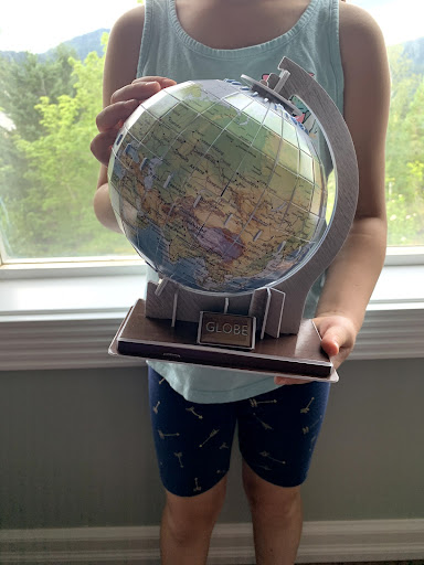 Straight from the 8-year-olds mouth, she has particularly enjoyed the panda stitching activity, the 3-D puzzles, and coloring the backpack. She was amazed that the globe puzzle (see picture below) not only spins, but also had our city labeled on it!