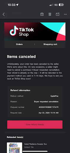 Read moreOrdered some Astral Radiance Booster Boxes last night from this store on TikTok Shop and saw my order was cancelled this morning with the reason being “buyer requested cancellation”, which I did not. Speculating that it was likely cancelled by them due to Pokemon Center going out of stock and to take advantage of higher future prices. Bad business practices aside, falsifying the reason for the cancellation as requested by me (likely to not draw ire from the platform) is ethically wrong and this should not happen.