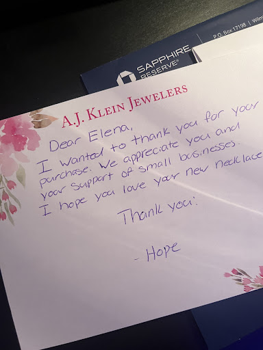 A.J. Kleins is an absolutely wonderful, family owned jewelry store. My partner and I worked with consultant Hope to find both of our dream engagement rings! We even found our wedding bands (before we were even engaged!). They are kind, accepting, and beyond helpful in the buying process for these special, one of a kind moments in your life. I spoke to the actual jeweler who made my engagement ring, and he answered all my questions (and I had a lot)! He offered my partner a variety of diamonds well within our budget that fit the expectations I wanted (cut, color, quality, etc) making it so easy for my partner to pick the perfect lab grown diamond. Even picking the setting took me a long time but Hope never pushed or pressured me - she let me see every ring I wanted and let me try on anything I requested (multiple times!). She even listened when I said there was a setting for an engagement ring in another store I wanted to try - I showed her a picture and she found the equivalent right there in the store in no time! When picking wedding bands, Hope allowed me to try every single variation of wedding band to ensure I got the one that I had pictured in my mind. She probably spent well over 90 minutes with me looking at all the options and helping me find the perfect band (after having spent near 2 hours finding the perfect engagement ring!)
