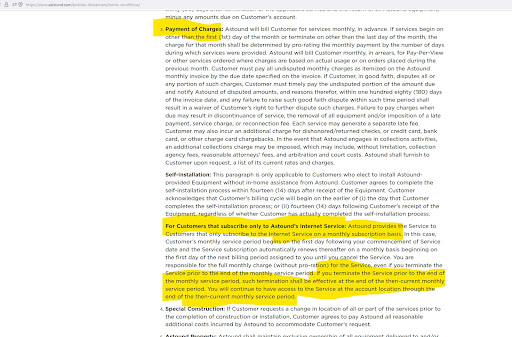 Reading the terms and conditions, under the ACTUAL section for termination of service (Line item #14), it states a customer can terminate services at any time, however, in a smaller section (Line item #3 for payment of charges) much earlier in the terms that is completely unrelated, they sneak in a small clause about only terminating on a billing service end date.