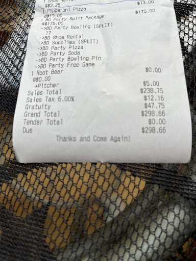 Read moreThis place doesn't deserve a one star rating.... over priced games, over priced food and drink. Wouldn't give a refund at all for only bowling 2 games, paid for 3. The lanes (approach) were completely dirty, the lanes are not taken care of as they broke down or wouldn't give the ball back almost every other throw. I understand as some things break down but if you read the other comments it seems like it's a pretty common occurrence. The staff was not friendly and I wouldn't give this place the time of day again. Every other one star review on this is...