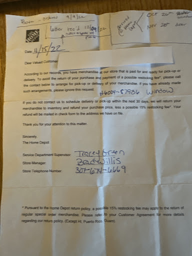I've called as many "store managers" for the Sheridan location as I can as well as the national Home Depot Complaint Departments "online." It has been nothing more than a series of being put on hold and employees with little to no background and even less ability to accomplish any meaningful assistance. Lots of wasted time with no progress.
