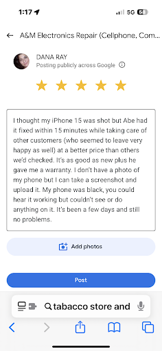 I thought my iPhone 15 was shot but Abe had it fixed within 15 minutes while taking care of other customers (who seemed to leave very happy as well) at a better price than others weād checked. Itās as good as new plus he gave me a warranty. I donāt have a photo of my phone but I can take a screenshot and upload it. My phone was black, you could hear it working but couldnāt see or do anything on it. Itās been a few days and still...