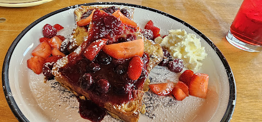 If you like your French toast an inch thick, with the luscious texture of bread pudding and topped with fresh blueberry compote, fresh raspberries and strawberries, and real whipped cream β well, this is your place. It was gently sweet with the sweet-tart berries. Perfect.