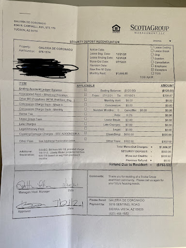 I have yet to receive any more response to my email or in person communications with the Galeria. The only response I have received is the one to my original post here in which the Galeria represented that it issued a return of my deposit on 9/30. I received that check today...just $125 of the total $550 deposit. There was no accounting, no explanation of any sort for the remaining $425. There was no one available when I moved out to walk the property with me. The bottom line: I left the property much cleaner when I moved out than it was when I moved in. I did not put a single hole in any of the walls. The fact that this company would hold back $425 without any discernable basis, let alone any explanation to me directly, is just questionable business practices. While I'd rather deal with this process privately, I have received no responses to my communications. I've lowered my rating to 1 star. Potential renters, beware.