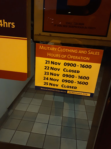 Read moreThis military clothing sales store (NOT military clothing AND sales...grrr!) is a typical MCSS. it has the usual assortment of military clothing, both issue and "compliant" items. As expected for an Army installation, items are focused on Soldiers for rank and decorations. There are a few rank items for Marines, fewer still for Airmen, and next to nothing for Sailors. Unfortunately, this is a smaller installation, so the assortment of footwear is limited to only one or two civilian/commercial variants.